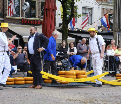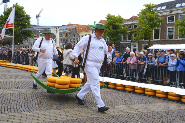 Er waren deze marktdag veel schoolkinderen op bezoek. De voorste kaasdrager is een zogenaamde Noodhulp die kaasdrager wil gaan worden. Hij is daarom herkenbaar aan zijn witte hoed. De achterste kaasdrager is Marco, bijnaam De Trompet.