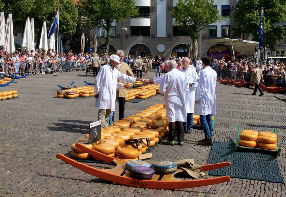 Ondertussen liep dit "echtpaar" in klederdracht naar hun boot die gevuld met goudse kazen zou gaan varen in de Alkmaarse grachten.
